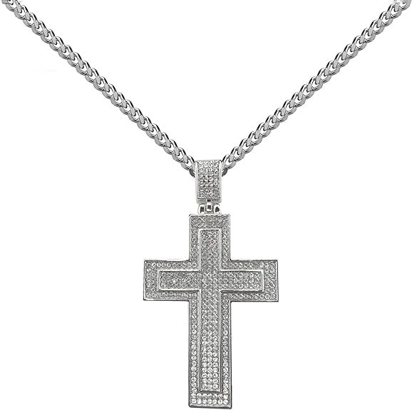 ORENTINI Plated Stainless Steel 3.5mm Cuban Link Chain with CZ Iced Out 3" Cross Pendant and Gift Box for Men, Woman. 28 In Length Lobster Clasp