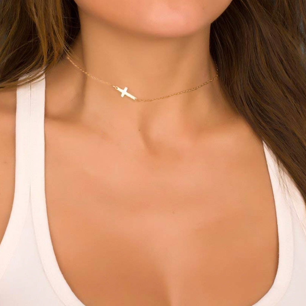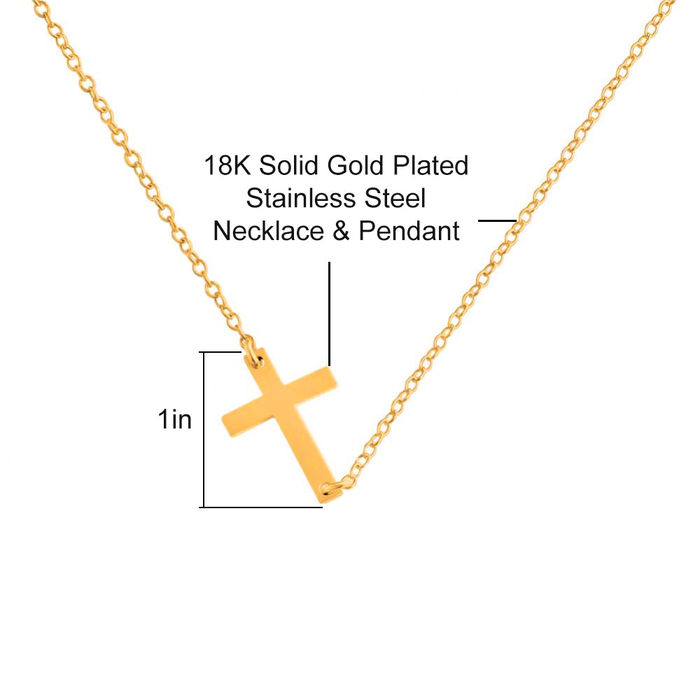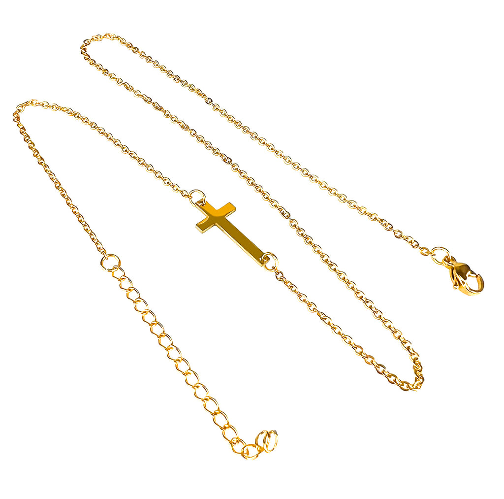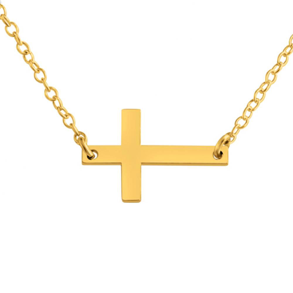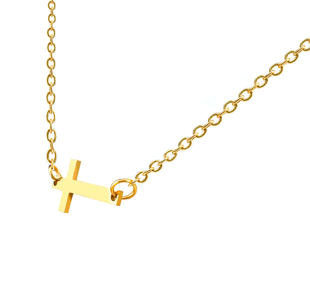 ORENTINI 2mm 18K Gold Plated Stainless Steel Simple Cross Sideways Pendant with Open Link Style Choker Chain for Woman. 16In Length Lobster Clasp