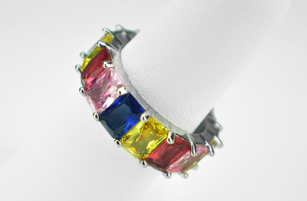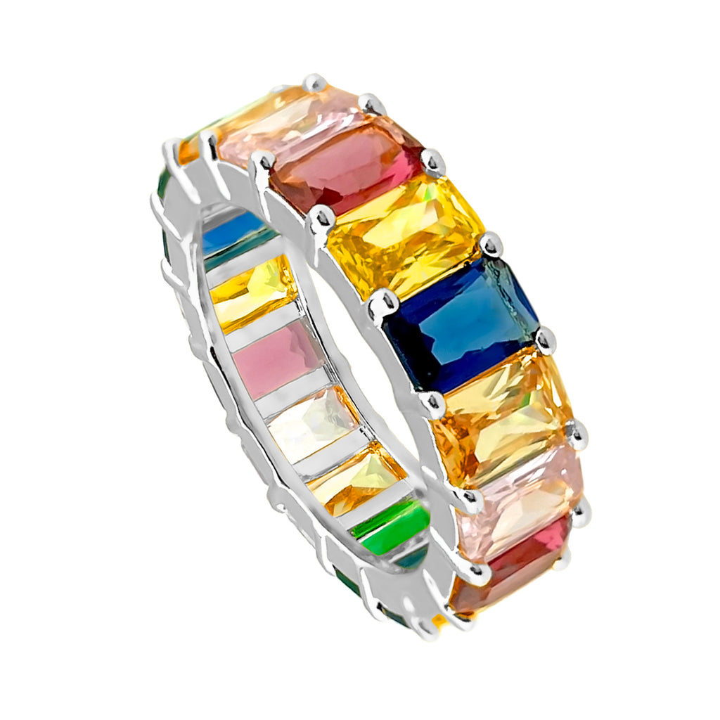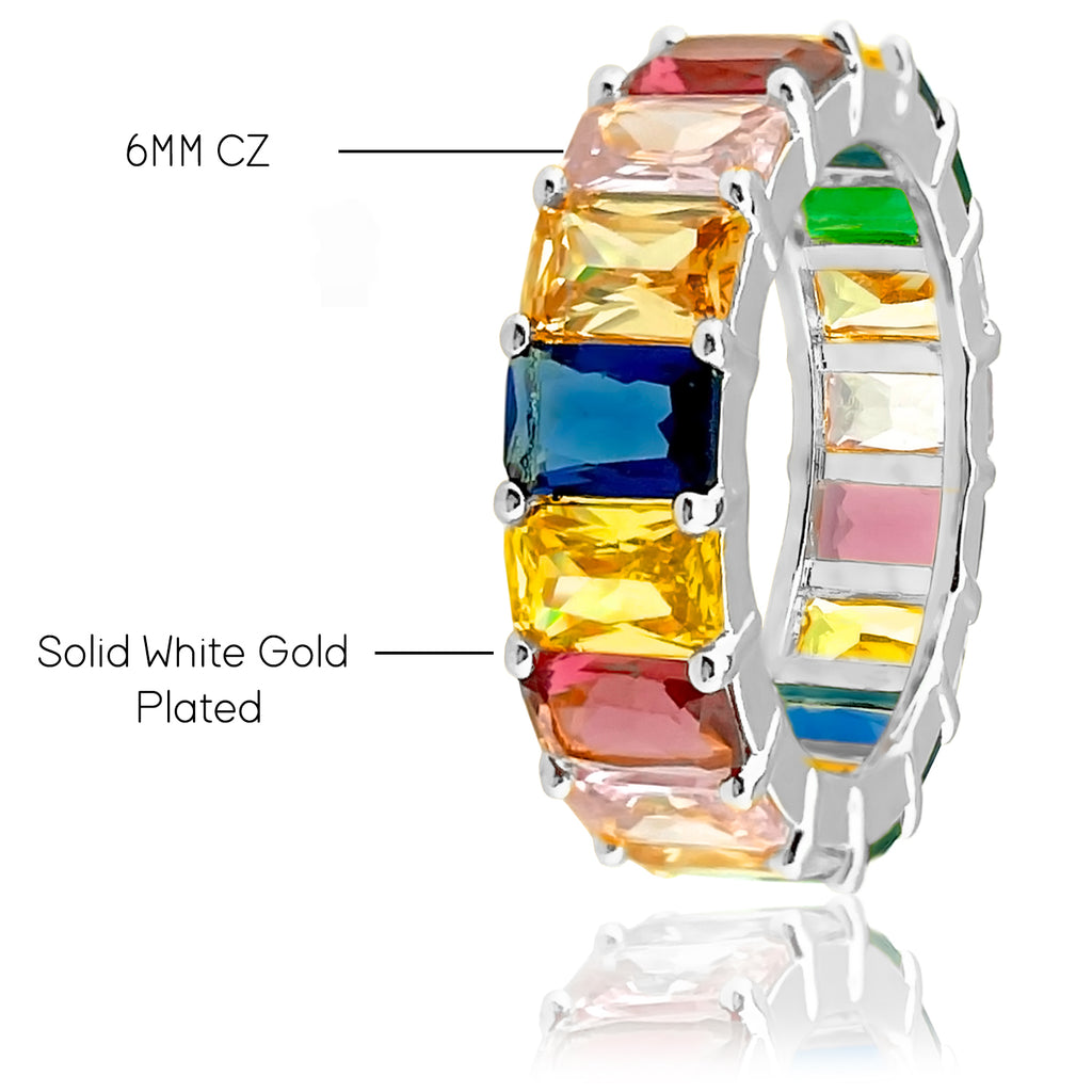 ORENTINI White Gold Plated Statement Eternity Ring Band With Multi-Color Rainbow Emerald Cut Cubic Zirconia